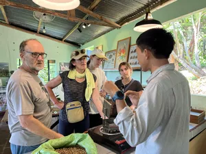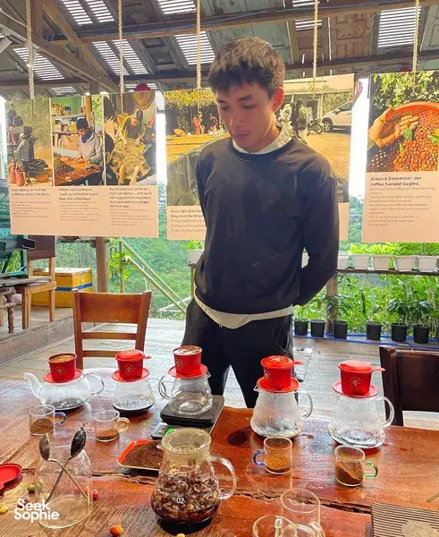 Skip the cafe hopping and head straight to this unique tasting experience where you'll be learning about the coffee journey from bean to cup from a local farmer, involved in the whole process! You’ll be visiting a Huy's coffee shop where you’ll be tasting properly brewed coffee from beans grown and processed with care at his farm. And you'll also get to experiment with roasting your own beans, try various brewing styles, and make your own traditional Vietnamese Phin coffee overlooking the city. What makes this experience special is that it’s run by an organic farmer who’s been perfecting his craft for nearly a decade. Unlike commercial farms, this one is completely chemical-free and all about sustainability. You’ll get to explore the full process from bean to cup, and really grasp the difference between mass-produced and lovingly nurtured coffee. This is perfect for coffee lovers who want more than just a café visit — it’s ideal for those curious about sustainable farming, looking to connect with locals, and who enjoy learning how things are made the traditional way. Plus, the farm has some very friendly resident cats and dogs that make the experience even more fun!What to ExpectVisit a coffee shop in Da Lat city run by an experienced organic coffee farmerLearn about different types of coffee including Robusta and Arabica processed three different waysHands-on coffee roasting session with light, medium, and dark roast optionsTry coffee brewed using a variety of techniques and discover the flavour differencesMake your own cup of traditional Vietnamese Phin coffeeEnjoy a peaceful setting with farm animals and great city viewsGood to KnowThis experience takes place in Centre Da Lat cityTransport, food, and custom drinks are not includedThis is a year-round experience and suitable for most ages