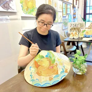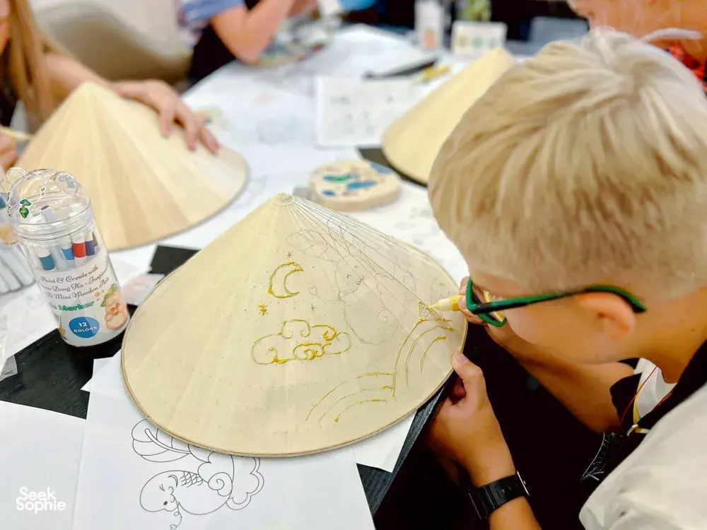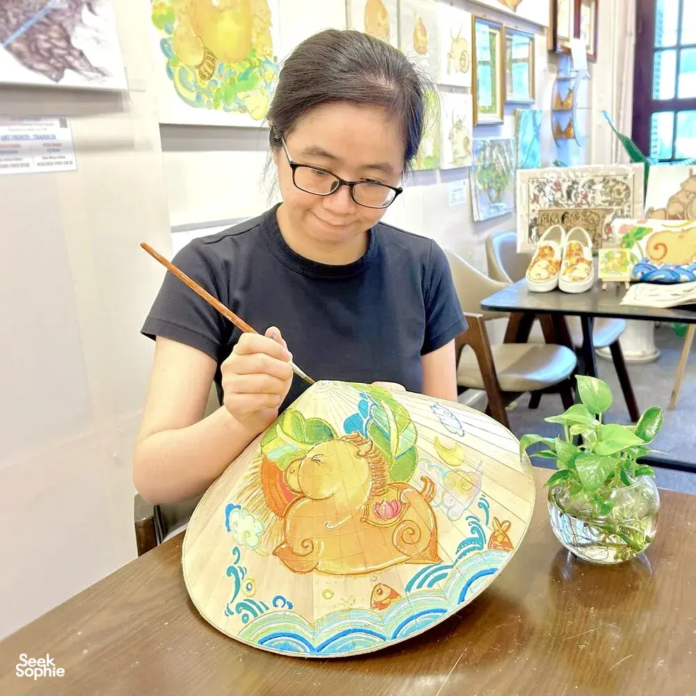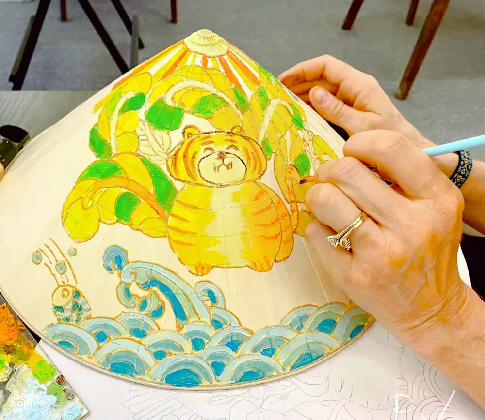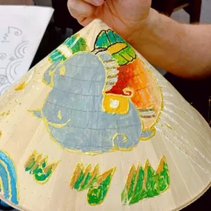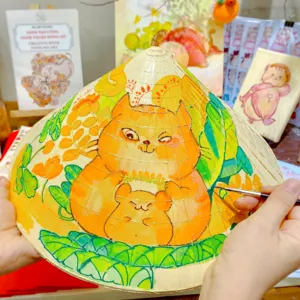 This is a hands-on Vietnamese folk art workshop with a modern twist, at one of Saigon’s most interesting art studios. Perfect if you enjoy creative, cultural experiences that feel a bit different.Instead of a typical craft class, you’ll be learning how a local artist is reimagining traditional Đông Hồ folk art today. Your host Bam Bi is reimagining Vietnamese culture through her work - blending Đông Hồ folk art with a contemporary style you won’t usually see. Her studio isn’t about preserving tradition exactly as it was, but bringing it into today in a way that feels fresh and alive.You’ll paint your own piece using a conical hat (nón lá) as your canvas, but the focus isn’t the hat. It’s understanding the stories behind the motifs, and then making them your own. It’s simple, guided, and surprisingly relaxing. No art skills needed!By being part of this experience, you're also actively supporting a local artist and keeping folk art traditions alive today.What to ExpectLearn the history of Dong Ho Art, a traditional folk art of Vietnam.Discover the significance of the Conical Hat, an iconic symbol of Vietnamese culture.Receive expert guidance from our artist as you paint a zodiac animal on your hat using our signature style.Enjoy live music featuring piano and bamboo flute.Enjoy Vietnamese tea and cookies while your drawing dries.Take home your very own personalized Conical Hat and a Creative with Dong Ho Art Kit.TipsThe workshop is suitable for all levels, so don't worry if this is your first time drawing.Kids under 13 can join in the fun! They may paint with their parents on the same conical hat free of charge, or pick a mini wooden plate with a carved animal to decorate and color themselves (available as a paid add-on).