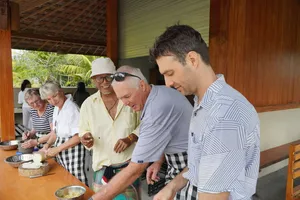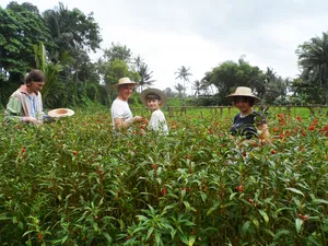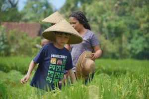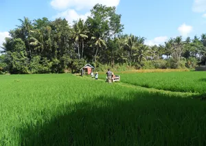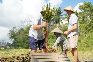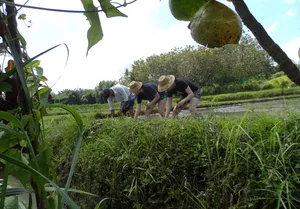 For curious foodies, or travellers who love to peek under the surface of local culture, this sustainable farming experience is like no other. The hands-on activities of rice cultivation, irrigation, and cooking local dishes offer a unique opportunity to learn about the traditional ways of life and the importance of sustainability in Bali. Go beyond the beaches and temples to discover the island's rich agricultural heritage and the sustainable practices that have nourished generations.This experience is perfect for those looking for a unique and immersive cultural experience, families with children who want to learn about where their food comes from, or anyone who wants to get away from the tourist crowds and experience authentic Balinese life.What to ExpectYou'll learn about the traditional farming methods of Bali, including the intricate SUBAK irrigation system and the spiritual importance of the many shrines and temples that dot the farmland.But this experience isn't just about education – you'll also get your hands dirty by planting rice seedlings, trekking through lush rice paddies, and fishing in freshwater ponds.Afterward, enjoy cooking traditional Balinese dishes alongside your friendly hosts and savoring the fruits of your labor.Not only is this experience an opportunity to support small, sustainable farmers, but it's also a chance to connect with the local community in a meaningful way.Sample menuWhite and or Yellow RiceFish Satay LilitGrilled Banana Wrapped FishGrilled Fish / Fresh Catch *optionalSlow Cooked Chicken / Ayam Betutu or Other Chicken DishTempe and Tofu DishesBanana Trunk Soup or Moringa Leaf SoupWater Spinach Vegetables DishAssorted Balinese SambalsOther DishesDrinks listTraditional Balinese Organic Coffee ( your own roasting - some roasted beans to be taken home as free souvenir ).Red Rice Tea or Herbals TeaMineral WaterYoung Coconut ( Optional ).DessertBlack Rice Pudding or Banana Kolak