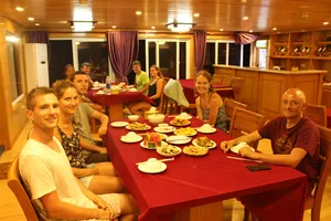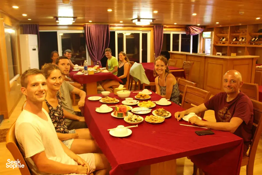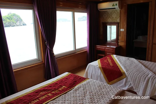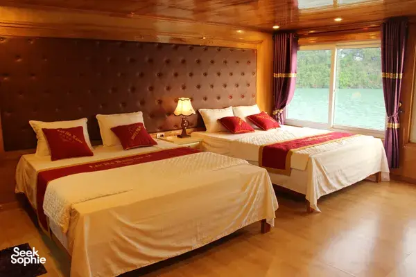 This 2D1N cruise is a great pick if you want a less-crowded, more “proper” exploration of Lan Ha + quieter corners of Ha Long Bay — with a few rare perks you don’t usually get on overnight boats.The biggest standout is the flexibility: it’s designed for genuine last-minute hiccups, so you can cancel up to 24 hours before or reschedule if something unexpected comes up (think flight delays or getting sick) — a refreshing change from the usual 3-day notice or non-refundable policies.On the water, the route is longer than typical (nearly double) and planned to avoid peak crowd timings, so you’ll spend more time in calm, scenic areas — think swimming at secluded beaches and 1.5–2 hours of kayaking through rock arches into hidden lagoons and tunnels (including Ho Ba Ham’s lagoons).What makes it feel extra personal is the team: fluent English-speaking guides who can chat beyond the script (history, society, local life) — and some even bring fun “bonus” talents like magic tricks or live guitar/flute that make evenings unexpectedly memorable.And if you care about the bay, you can join the guides for a beach clean-up along the way — a small but meaningful act to help keep the place beautiful.What to ExpectCruise around Lan Ha and Ha Long Bays, with less crowded scenic spots to enjoy peaceful landscapesVisit floating fishing villages and learn about local fishing lifeSwim or snorkel (for fun) at deserted beaches with provided equipmentKayak through rock arches, tunnels, and discover the landscapes.Stay overnight anchored in quiet lagoons, soaking in stunning sunsetsEnjoy delicious local food, including two hearty lunches, a dinner, and breakfast, with plenty of fresh fruitIf you like, try night squid fishing — a real local experienceGood to KnowThis cruise is more rustic-adventure than luxury — that’s part of the charm. It’s a steel boat built in 2018, comfy and functional, but not a high-end “hotel on water.”One rare perk: it’s super flexible. You can cancel or reschedule up to 24 hours before departure without penalty.You’ll have private cabins with hot showers and air-conditioning. Just a heads-up: at night, the generator/engine that powers the A/C can be noisy. In cooler weather, the boat can turn it off for a quieter sleep — but this only happens if everyone onboard agrees, since it affects all cabins.If you’re a light sleeper, leave a note at booking and the team will try to place you further from the engine room (subject to availability).Activities are generally suitable for most fitness levels, though kayaking and swimming do involve light physical effort.If you’re eco-minded, you’re welcome to join the crew for a beach clean-up along the way.Weather and tides can affect the plan, but the guides will do their best to adjust smoothly and tailor the flow to the group where possible.Important update (from May 1, 2026): Due to new regulations, overnight boats must return earlier. This cruise will end at 12:00 (noon) instead of 15:00, while the program/route remains the same (with a shorter, earlier lunch on the last day).Amenities/facilities8 private cabins (4 double, 2 triple, 2 family), each with a private bathroom, hot shower, fan, and air-conditioning.Shared spaces include a dining room, a bar area with fans, and an open relaxing deck for views and sunset moments.Kayaks included for exploring lagoons and quiet corners up close, plus snorkelling gear available for those who want to swim with a mask and fins.Freshly cooked local meals prepared onboard.