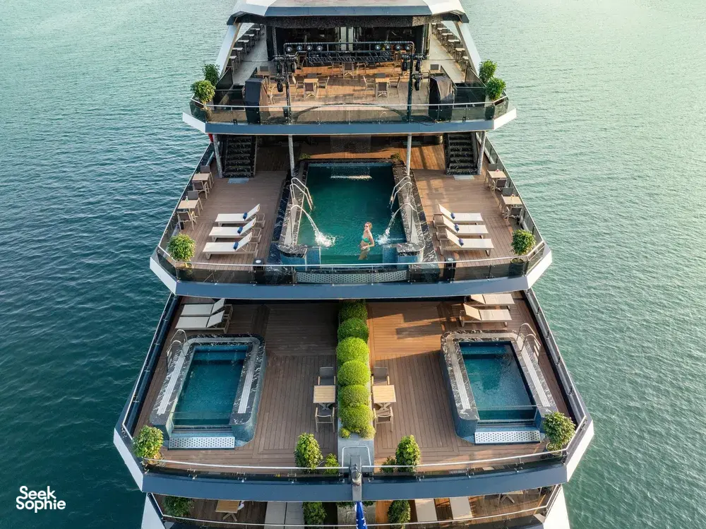 Khanh started this cruise line in 2025 after more than two decades in luxury cruise hospitality. Drawing inspiration from the natural beauty of Cat Ba’s sea and islands, he created the cruise to offer guests a thoughtful, comfortable way to experience Lan Ha and Ha Long Bays. The cruise features six spacious decks and 43 well-designed cabins, including a few with private pools for those after something extra special.