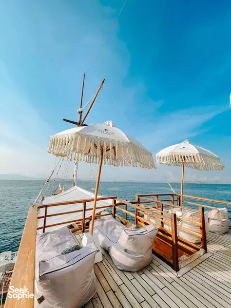 Sail through Komodo on one of the most stylish and romantic boats - perfect for couples!The boat is beautifully designed with plenty of common areas for you to find the perfect place to chill and take in the views, full-size bean bags you can actually lie down on, and an outdoor shaded dining area with sea views.It’s an especially great choice for honeymooners or couples celebrating an anniversary - the private cabins are spacious, and the crew can arrange thoughtful romantic touches like flowers on the bed or a decorated bathtub set up to make your trip extra special.The food onboard is exceptional - almost all our guests talk about how fresh and yummy the food is with a good mix of Indonesian and Western cuisine. Plus, there are always welcome drinks waiting for you when you return from trekking or snorkelling adventures.To cap it off, there's a dedicated onboard photographer who will capture plenty of photos throughout the trip, and send it out in 1-2 days after your trip, so you can relax and enjoy every moment without worrying about documenting it yourself.What to ExpectDay 1: You'll be whisked away from your hotel or the airport in Labuan Bajo and embark on your adventure. First up: snorkeling in the turquoise waters of Sebayur and Taka Makassar. After fueling up with a delicious lunch, enjoy an afternoon filled with more snorkeling and the anticipation of a mouthwatering dinner under the stars.Day 2: Rise and shine with a pre-dawn trek to Padar for an unforgettable sunrise. Afterward, it's time to dive into the underwater world at Pink Long Beach. The day continues with treks on Komodo and Pimpe Island, where you'll hopefully spot the legendary Komodo dragons in their natural habitat. As the sun sets, enjoy a spectacular sunset show where thousands of flying foxes fly out of Kalong Island.Day 3: Start your day with a leisurely hike and a refreshing dip at Kelor Island. After a final delicious lunch onboard, it's time to bid farewell to your floating paradise and head back to Labuan Bajo, arriving by noon.TipsRemember to bring cash for the Komodo National Park entrance fee.While the itinerary mentions trekking, these are generally beginner-friendly hikes. However, it’s always wise to wear comfortable shoes.Don’t forget to show your appreciation to the fantastic crew with a tip at the end of the trip.Boat Facilities & Amenities6 comfortable cabins, each with an ensuite bathroom and air-conditioning.Indoor lounge with comfy sofas, pillows, a TV, and karaoke - perfect for relaxing after a day of adventure.HEPA filter in the indoor area to keep the air fresh and clean.Outdoor relaxation area with beanbags, pillows, and umbrellas for soaking up the sun in style.Dedicated outdoor dining area for enjoying meals with stunning ocean views.Cabin Details:2 upper deck cabins (Japanese rooms): Double bed + ensuite bathroom with hot water + tatami table + big ocean view windows +shared balcony2 main deck cabins (Western rooms): Double bed + ensuite bathroom with hot water and bathtub + shared balcony2 lower deck cabins (Balinese rooms): Double bed + single bed + ensuite bathroom with hot waterChild & Infant Pricing:Infants (0-2 years old): Free of charge.Children (3-5 years old): Please contact us. We will be able to provide you further information on special discount for your children.Children (6 years and above): Same pricing as adults.