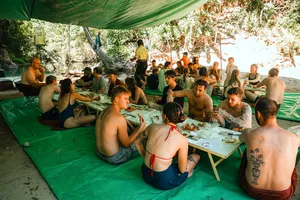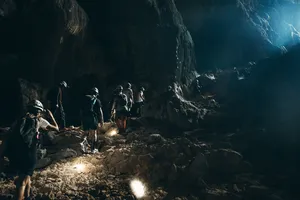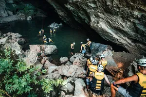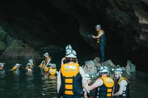 Looking for a proper jungle adventure in Phong Nha but only have a day? Get a taste of Phong Nha’s legendary adventure—this one-day trek packs in caves, swims, and cliff jumps, offering a thrilling glimpse into the region’s wild side without the full-on intensity of multi-day expeditions. It’s also the only day tour that includes free pick-up from Dong Hoi (about 50km away), making it super handy if you’re flying into Dong Hoi Airport or arriving via train at Dong Hoi Station. You can jump straight into the adventure without worrying about transfers or extra costs.You’ll trek deep into the lush heart of Phong Nha – Ke Bang National Park, explore the enormous Elephant Cave, swim in the gorgeous Ma Da Lake, and float your way through the 600m-long Tra Ang water cave in total darkness—yes, headlamp on, floating on your back, and just soaking it all in. Add in a riverside BBQ lunch with the local speciality Moi Cheo and the chance to cliff jump into natural pools, and you’ve got a bucket-list worthy day.This is perfect for travellers who are short on time but want maximum adventure. Great for friends, couples, and families with kids over 9 who like a bit of challenge. Also a solid pick if you’re arriving from Dong Hoi and want to skip the crowds and go straight into nature.What to Expect9km of trekking through jungle trails in Phong Nha – Ke Bang National ParkExplore the mighty Elephant Cave, once a wartime stronghold for Vietnamese soldiers. Equipped with headlamps and helmets, navigate mossy terrain and weave through glittering stalactites and stalagmites in the darkness.Swim and cliff jump in the refreshing Ma Da LakeBBQ lunch by the lakeside, featuring Phong Nha’s signature Moi Cheo sauceSwim 600 metres into the dramatic Tra Ang water cave (life jackets provided)Free pick-up from Phong Nha or Dong Hoi (including Dong Hoi Airport & Train Station!)Friendly, knowledgeable local guides who care about keeping the jungle clean and the experience meaningfulGood to KnowDifficulty level: 5/10Your shoes and clothes will get wet—river crossings and cave swimming are all part of the funSpare trekking shoes (sizes 37–45) are available, or you can bring your own. Avoid waterproof boots—they won’t dry in timeAll safety gear (helmet, gloves, headlamp, life jacket, towel) is providedLunch is included, and they cater to vegetarians and vegans—just give them a heads upBasic fitness required—ideal for active travellers aged 11+, even if you’re not super experiencedThe trail covers about 9km through dense jungle and rocky paths with several river crossings. Terrain can be slippery and muddy, especially after rain. You'll also swim 600m into and out of Tra Ang Cave, guided and equipped with flotation gear. While adventurous, it’s still manageable for first-timers who are comfortable in water and up for a full active day.