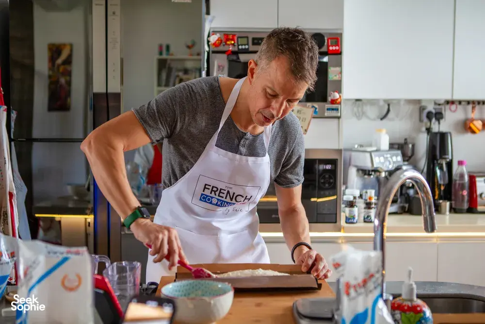 Eric memulai perjalanannya pada tahun 2022, menggabungkan latar belakang Prancisnya dengan kecintaannya pada dunia memasak. Tumbuh di keluarga yang menjadikan makanan enak sebagai bagian dari keseharian, dia pun tertarik masuk dapur sejak kecil. Dia belajar di Sekolah Éric Kayser dan L’Atelier des Chefs, menghabiskan waktu berjam-jam menyempurnakan resep klasik. Eric sangat memperhatikan cara mengajar, karena dia percaya siapa pun bisa memasak hidangan Prancis yang lezat jika mengikuti langkah-langkah yang tepat. Gaya mengajarnya santai, ramah, dan penuh perhatian terhadap tradisi dan proses belajar.