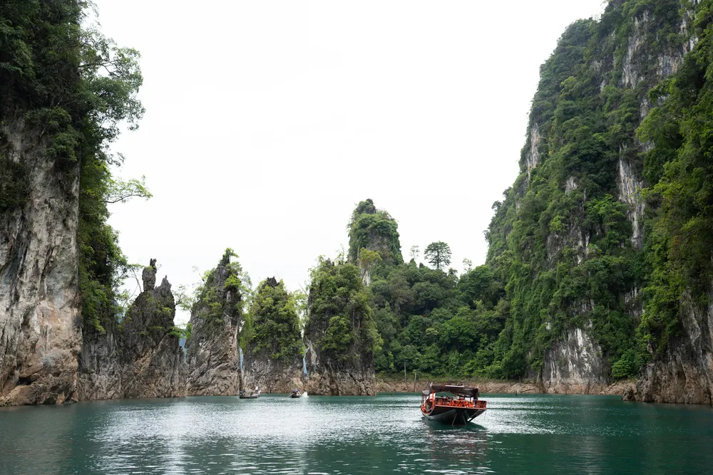 Cheow Lan Lake is located in the Surat Thani Province in Southern Thailand, and it isn’t just another “scenic spot.” Even though it’s getting more popular, it still feels really raw and wild. You’re on this huge lake with towering limestone cliffs that reminds us of Guilin, China, and jungle that’s older than the Amazon rainforest.