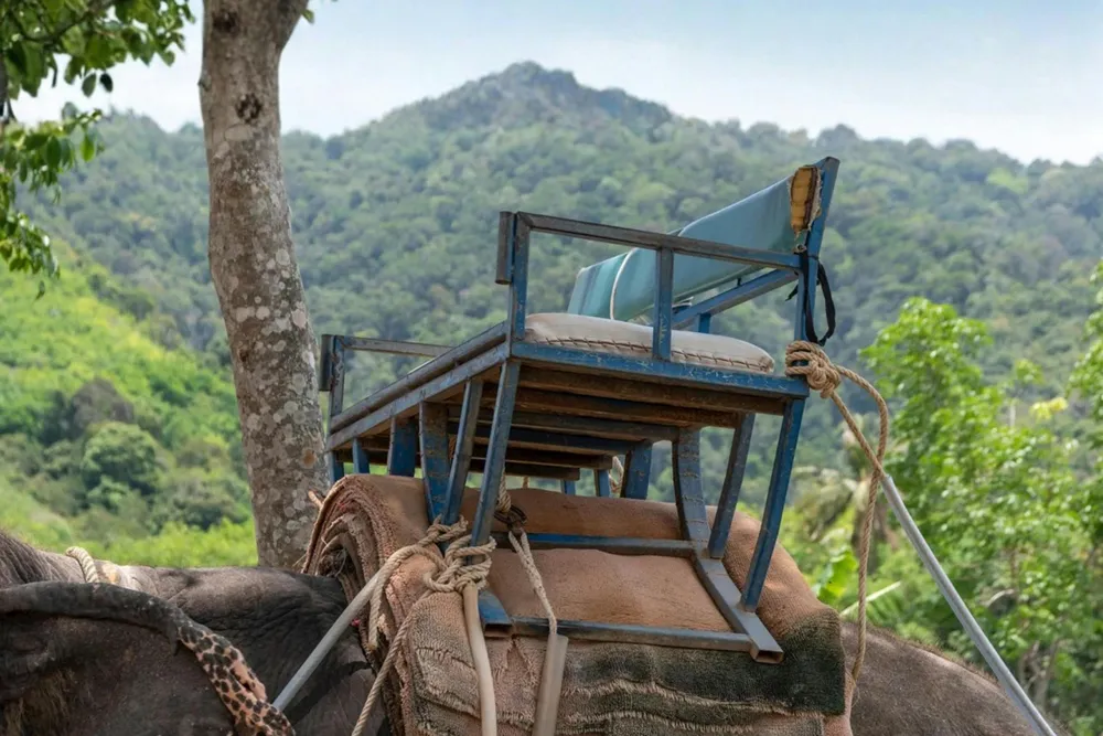 But three years later, he insisted on taking Mae Kam back for a blessing ceremony. Despite being asked not to, he put a trekking basket on her, and climbed to ride her.