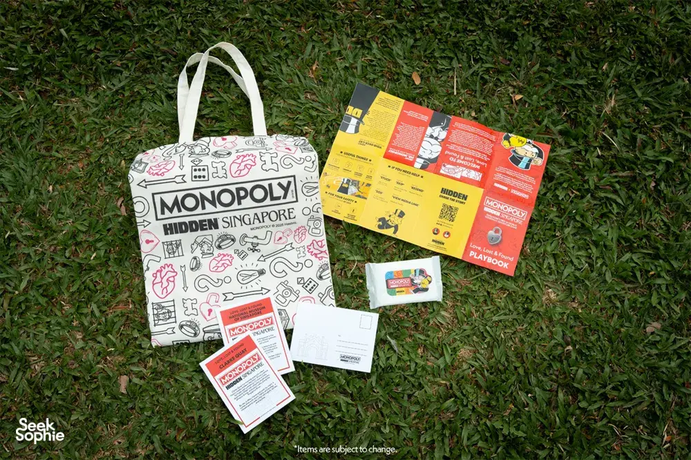 Tas Utility MONOPOLY: HIDDEN Singapore yang eksklusif, berisi barang-barang untuk membimbing dan menyenangkan perjalananmu