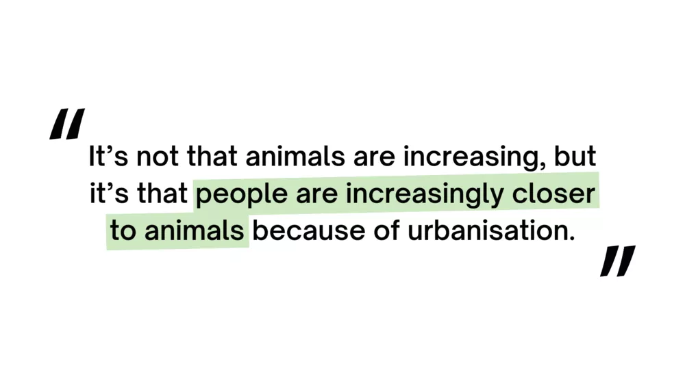 "When we clear forests to construct buildings, the wild habitats end up getting lost or fragmented. With not much connectivity, they come into shared green spaces and that's why we get more and more calls like civets in people's roofs.