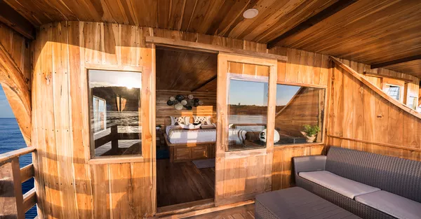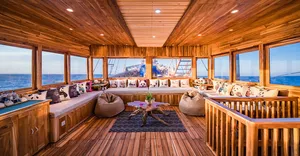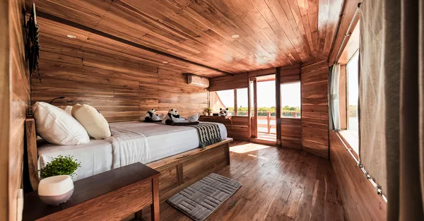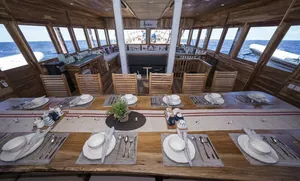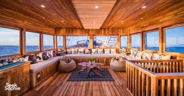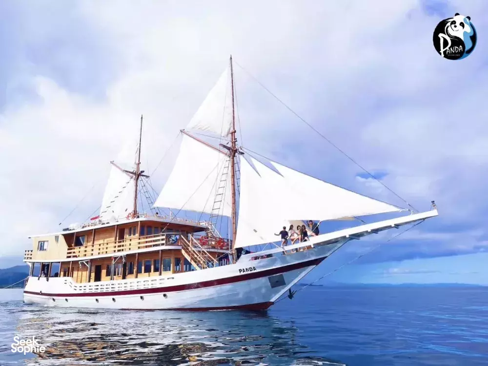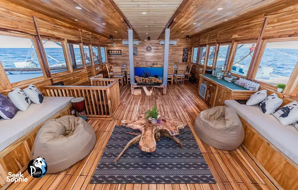 Panda号共有三层甲板,设有7间宽敞的套房客舱,其中4间配有超大观景窗。所有客舱均提供可定制的香薰疗法服务。Panda的休息区宽敞明亮,270度环绕玻璃视野,配备高清Sony电视、音响系统,还有各类海洋书籍,适合放松阅读。其他设施包括独立相机房、潜水甲板,设有充足的储物柜及冲洗水槽,方便清洁相机和其他设备。宽敞空间让你穿戴装备时不拥挤。持证潜水员可免费使用Nitrox空气。所有潜水装备(BCD、调节器、防寒衣、手电、SMB、雨披毛巾等)在出发前皆可免费试用。Panda也是科莫多少有的配备中英文导潜的船只之一。船上大厨专注于多国融合料理,每天提供五顿餐食,包括唤醒早餐、正式早餐、午餐、下午茶和晚餐,涵盖正宗中餐、西餐和印尼菜。导潜员将带你探索Karang Makassar、帕达尔岛、Batu Bolong、Castle Rock等世界级潜点。从奇妙微距生物到优雅的蝠鲼都能一一遇见。依照行程,预计将进行至少21次日间与夜间潜水。