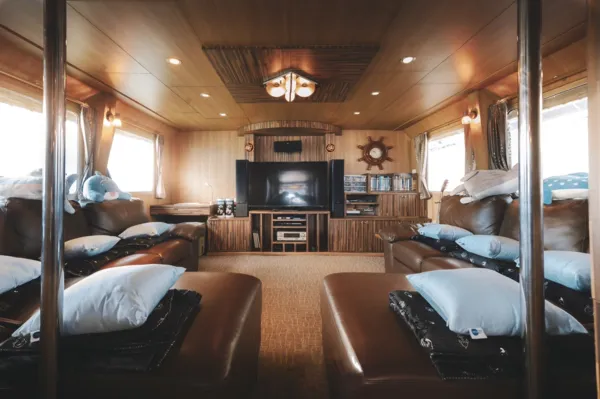 使用船上设施,如空调沙龙、85寸电视及电影库