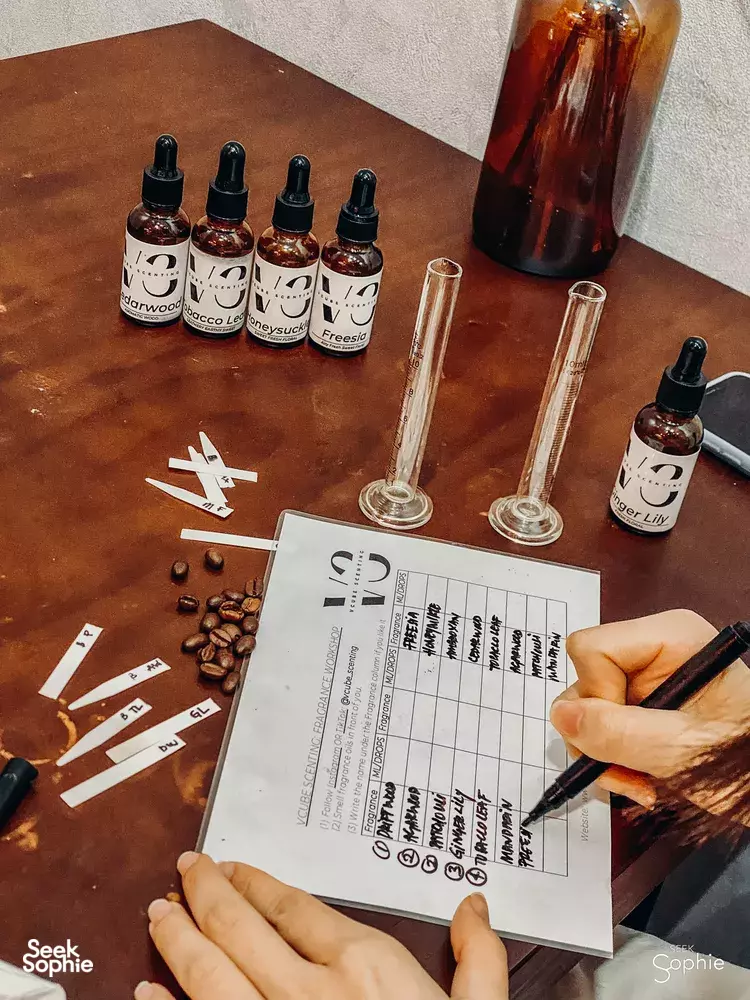 提供所有材料,包括量筒、香料油、精油和书写工具。