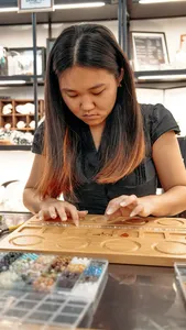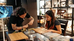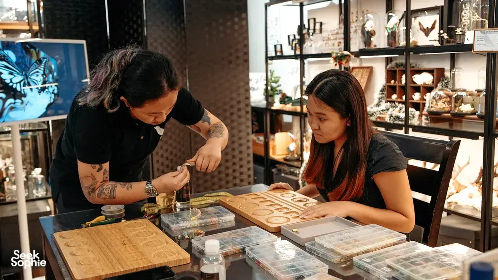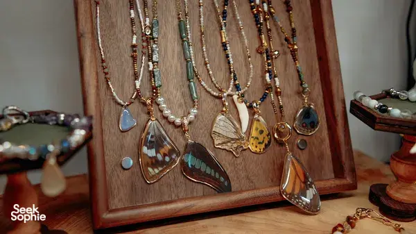 在沉浸式工作坊中用蝴蝶翅或骨头制作饰品套组
